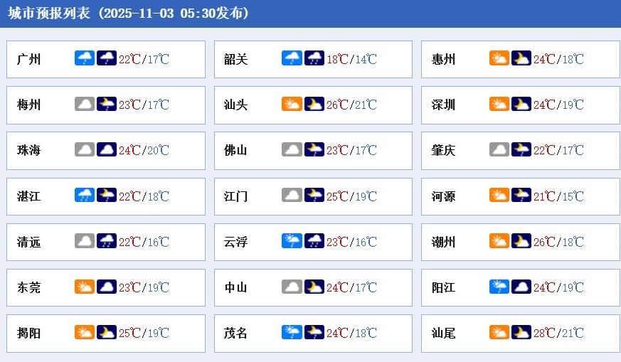 3日,粤北、珠三角西部和粤西市县多云间阴天,有分散小雨,其余大部市县多云到阴天。最低气温:南部沿海市县20~22℃,粤北偏北市县14~17℃,其余市县18~21℃。